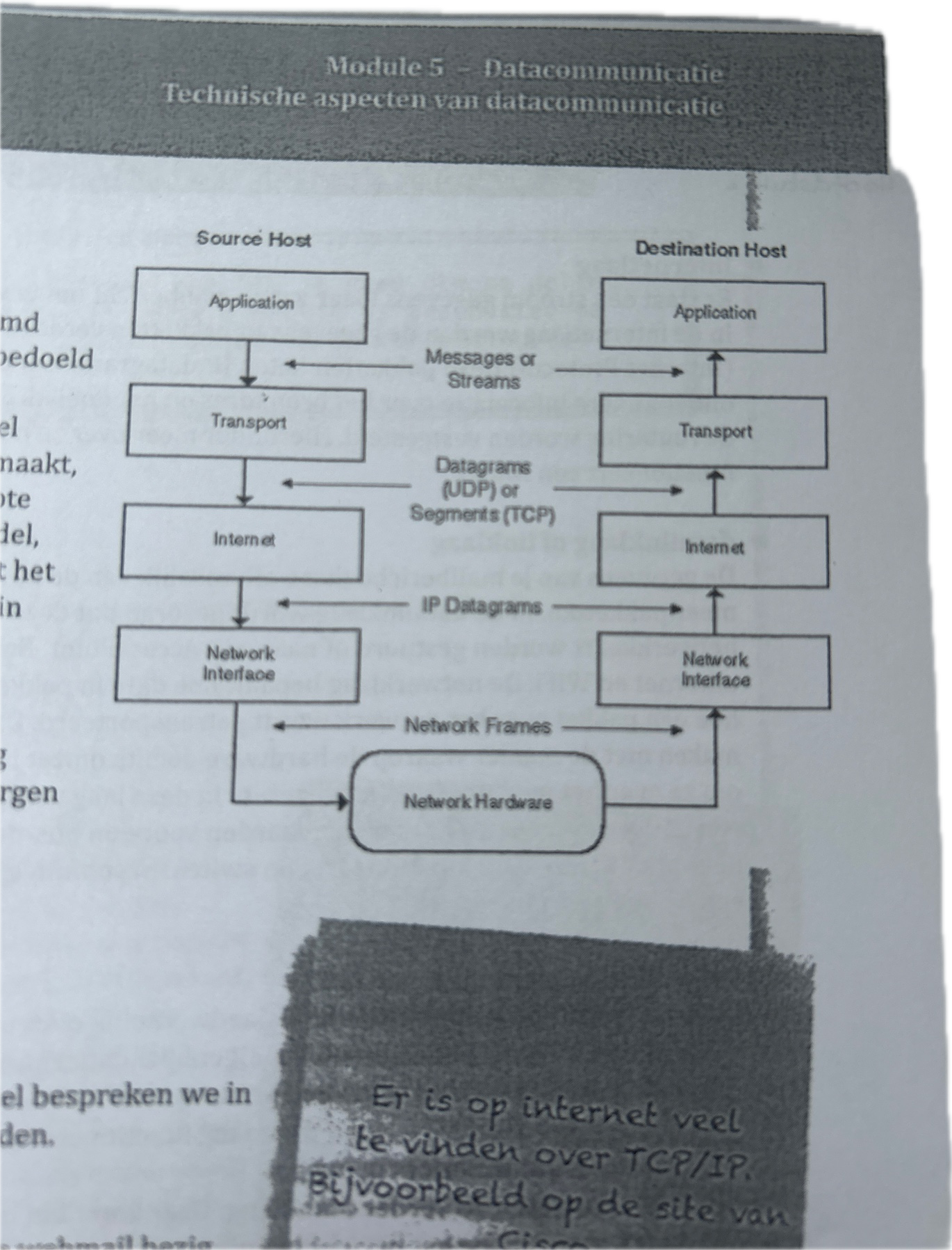 Het TCP/IP-model maakt daar gebruik van maar wijk er ook een beetje van af het heeft 5 lagen i.p.v. 7
